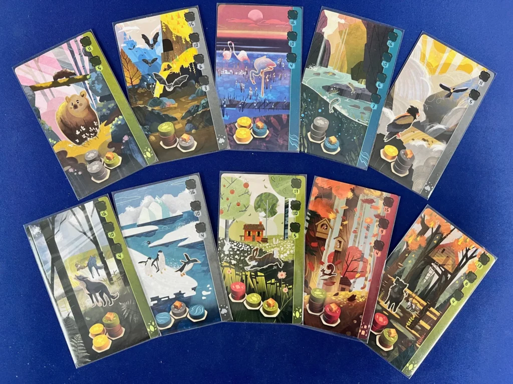 Découvert par hasard, ce jeu m’a immédiatement séduit par la simplicité de ses règles, ses magnifiques illustrations, et le plaisir que l’on éprouve à créer un petit coin de paradis accueillant des animaux de toute sorte. Les tours s’enchaînent avec fluidité, et rapidement, vous serez confronté à des choix cruciaux pour optimiser votre paysage.