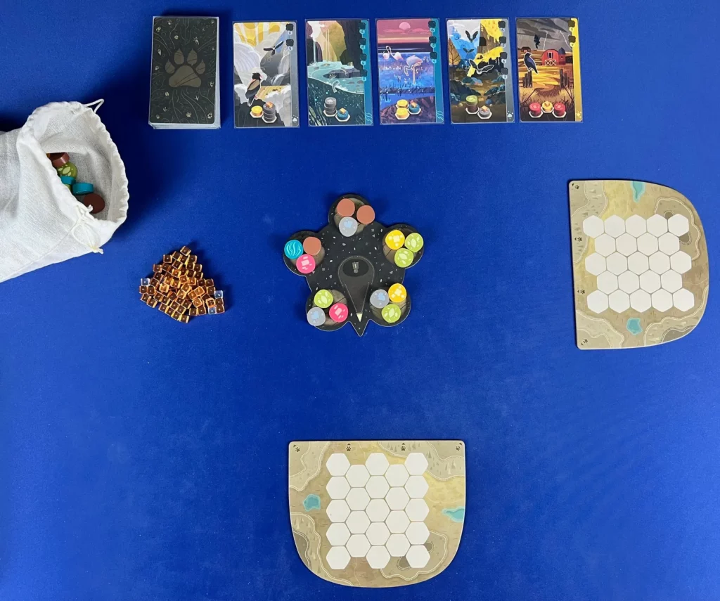 À chaque tour, vous choisissez parmi 5 lots de jetons représentant différents types de terrains (forêt, rivière, champ, etc.) que vous placez sur votre plateau. Ensuite, vous avez la possibilité de récupérer l’une des 5 cartes animaux disponibles.