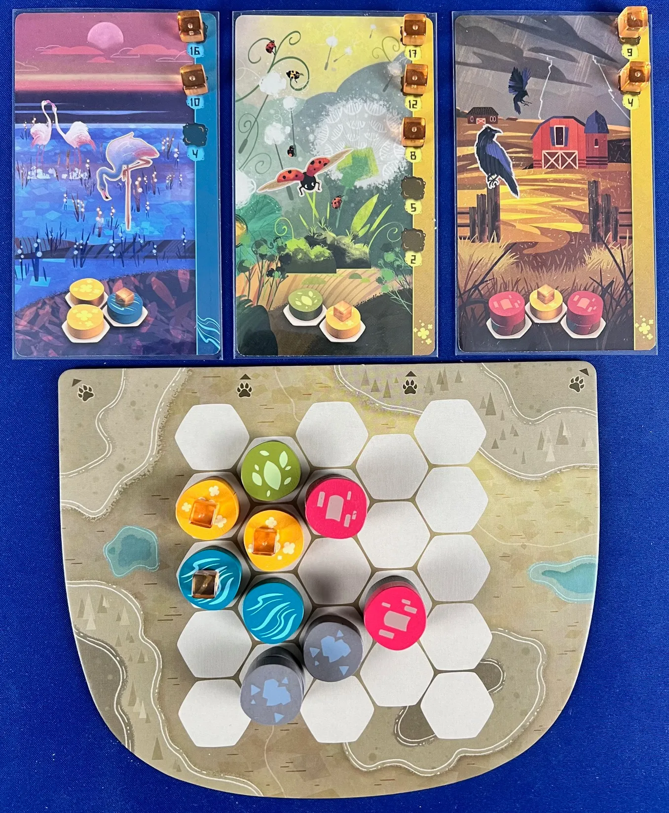 À la fin de la partie, vous comptabilisez les points de victoire visibles sur vos cartes animales, ainsi que les points associés à chaque type de terrain présent sur votre plateau