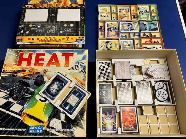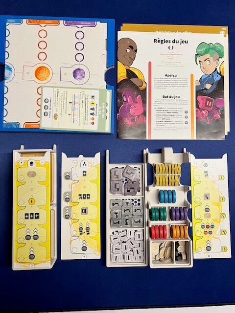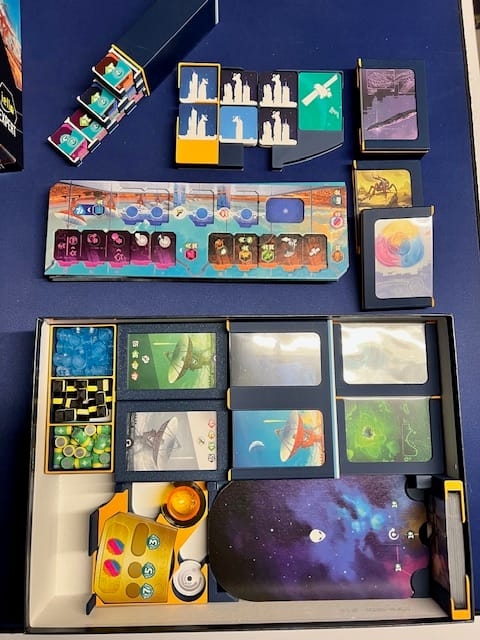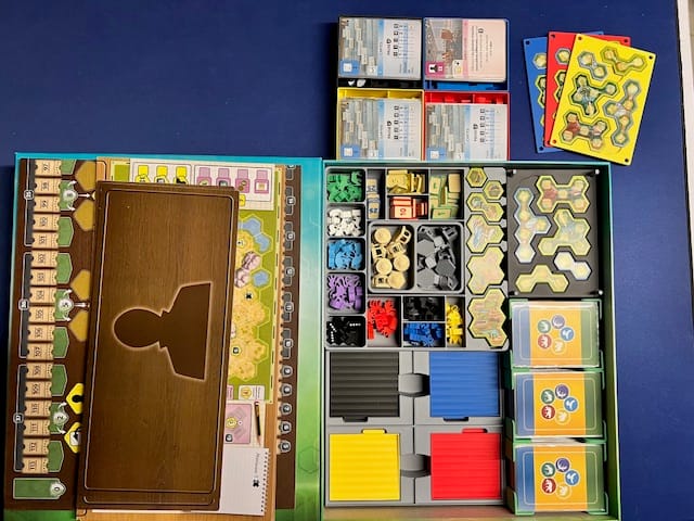 Un petit insert qui permet à chacun d’avoir ses éléments rapidement, de stocker les stands pour les jetons météos et le rangement de toutes les cartes et plateaux.